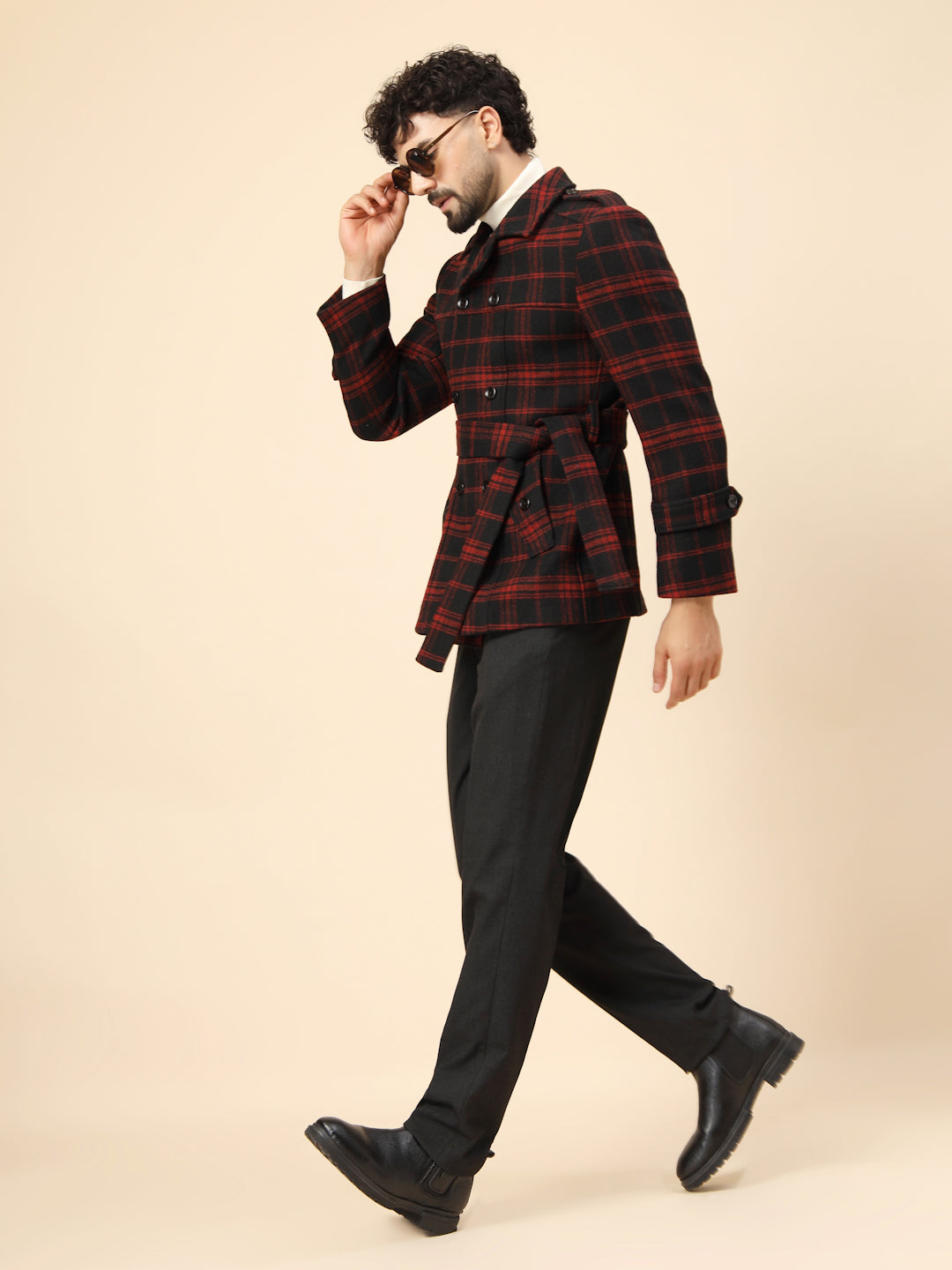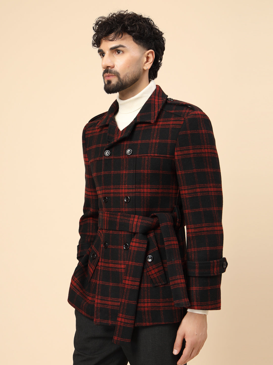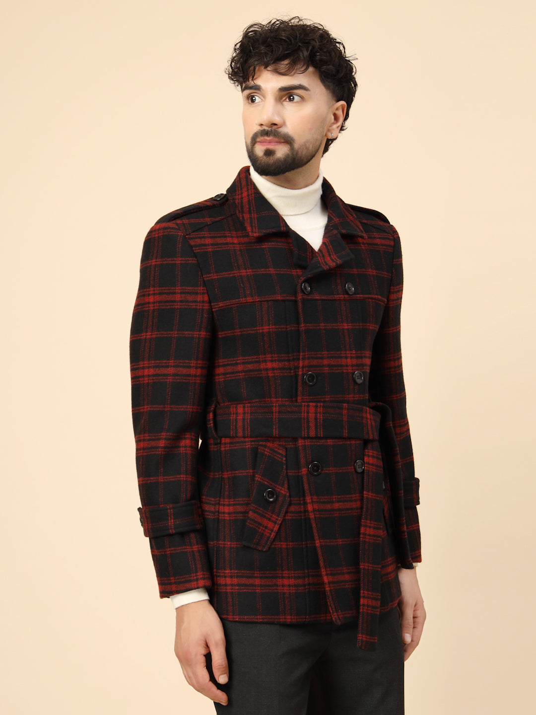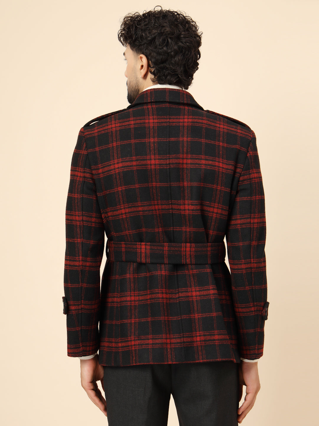 Black & Red Tweed double-breasted Check Short Coat