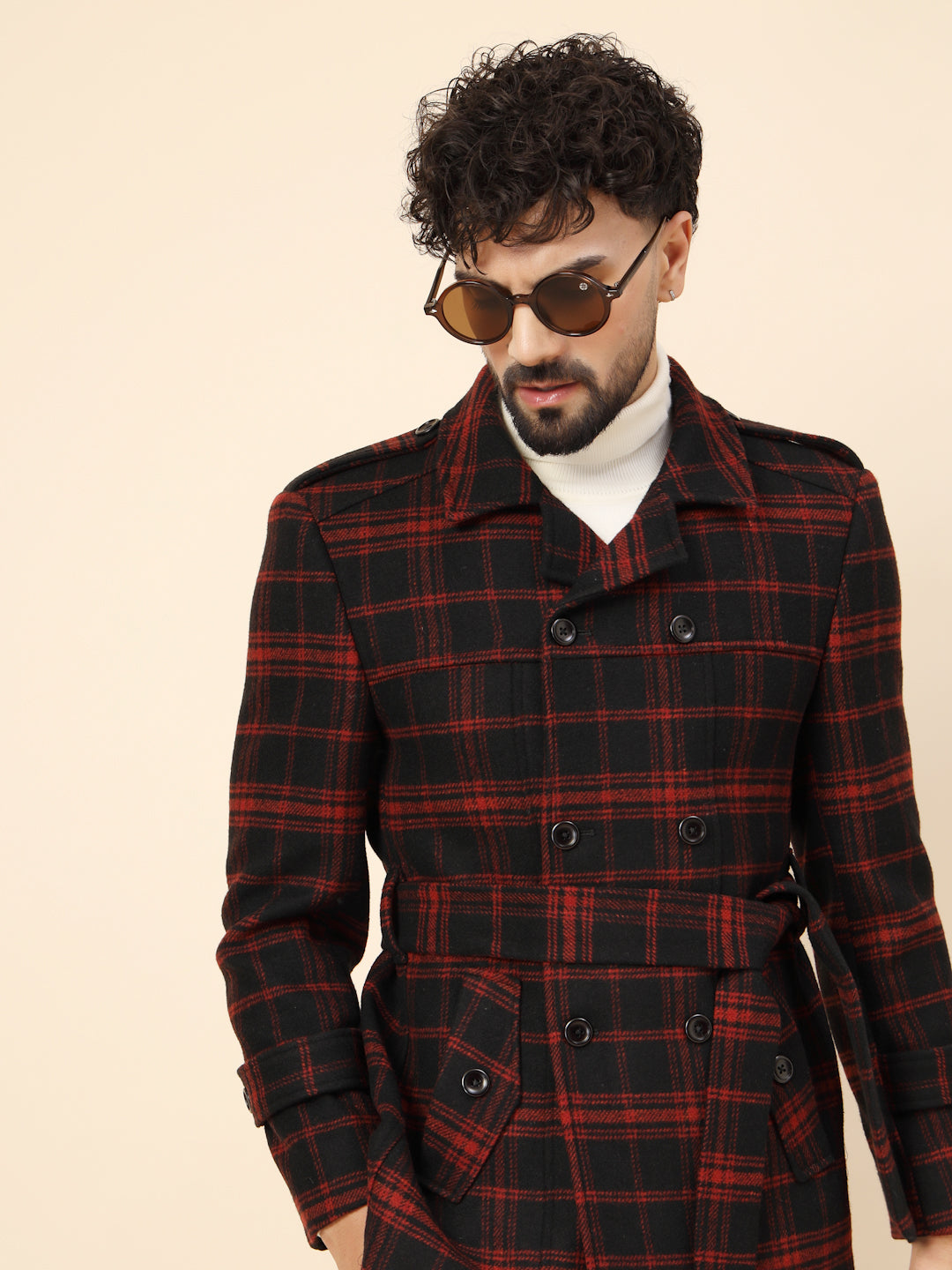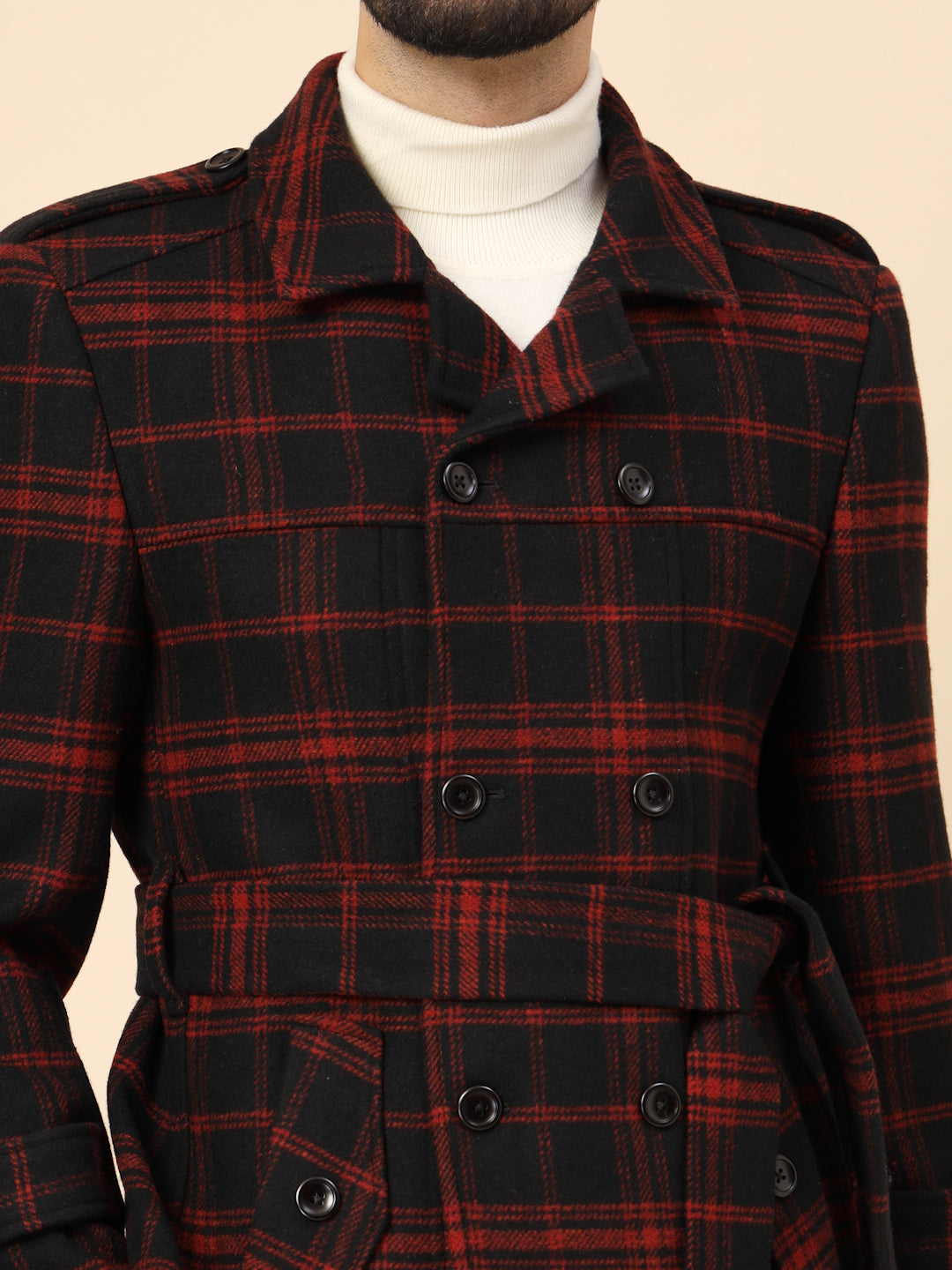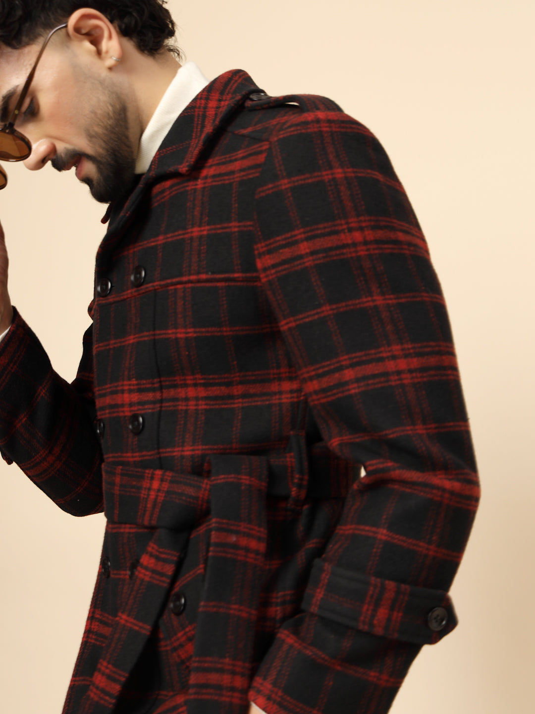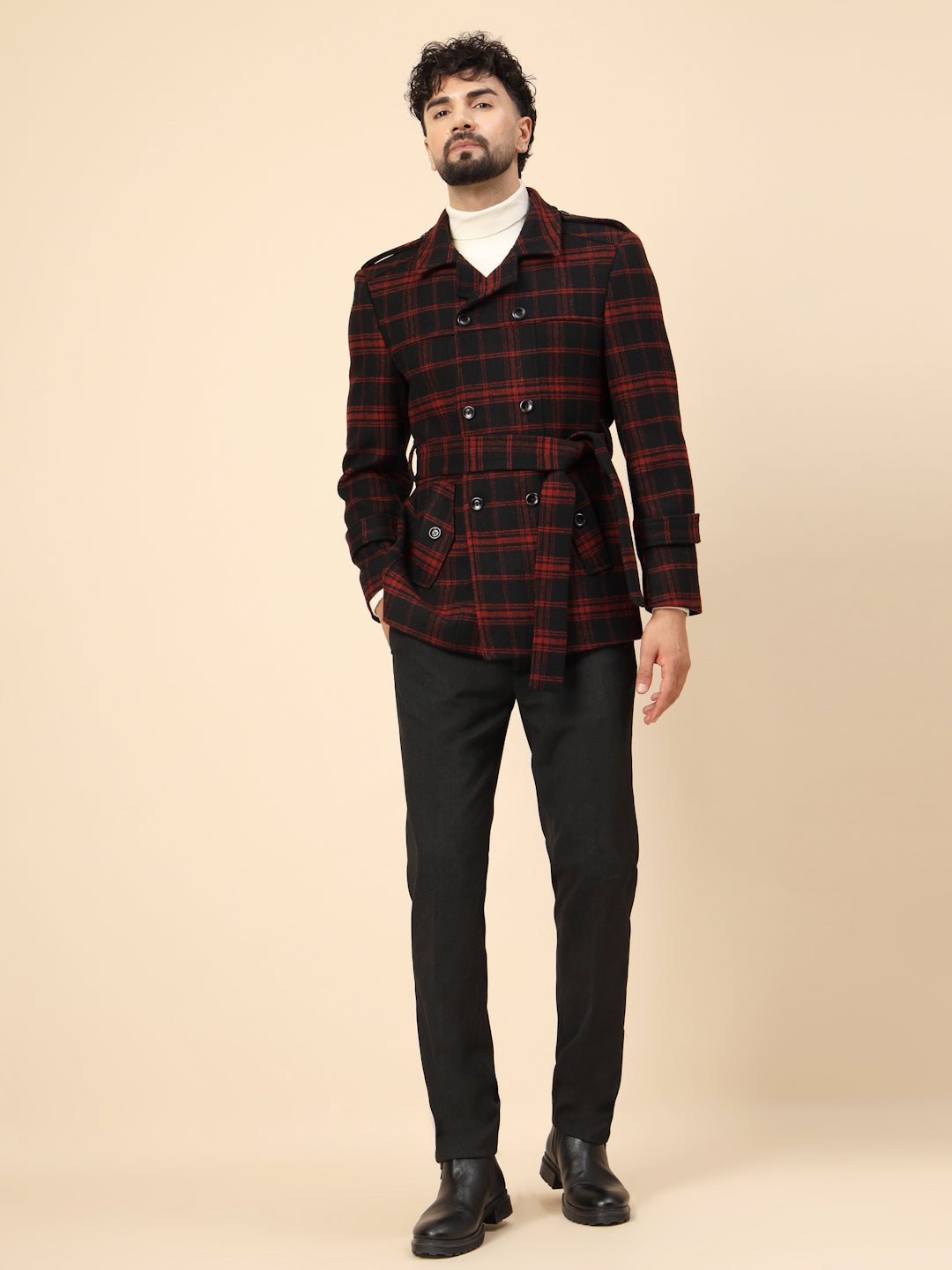 Black & Red Tweed double-breasted Check Short Coat