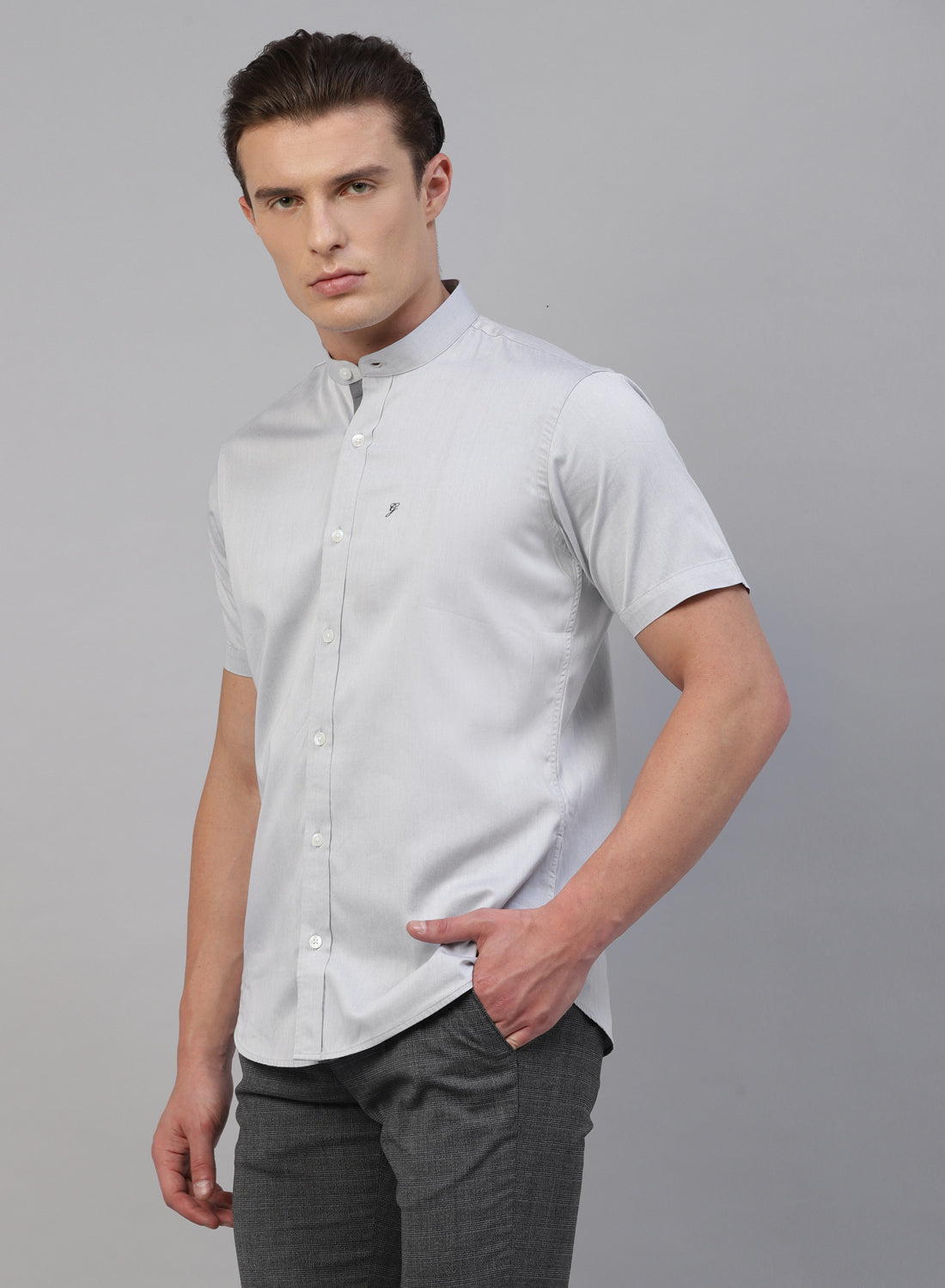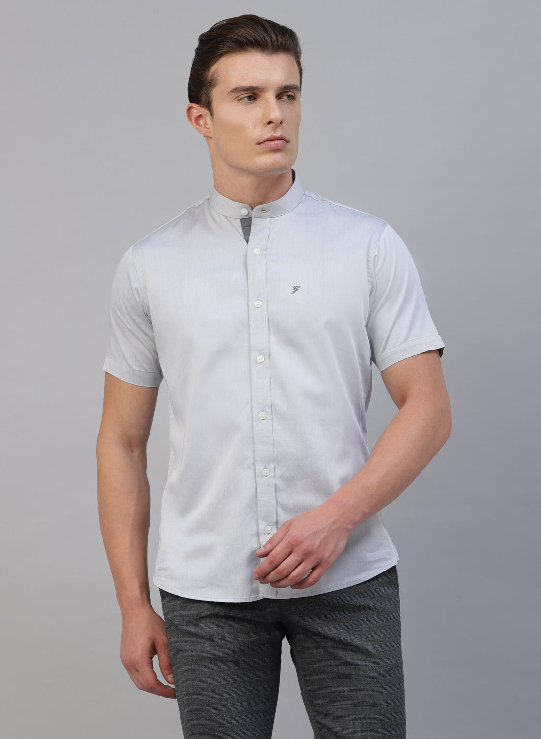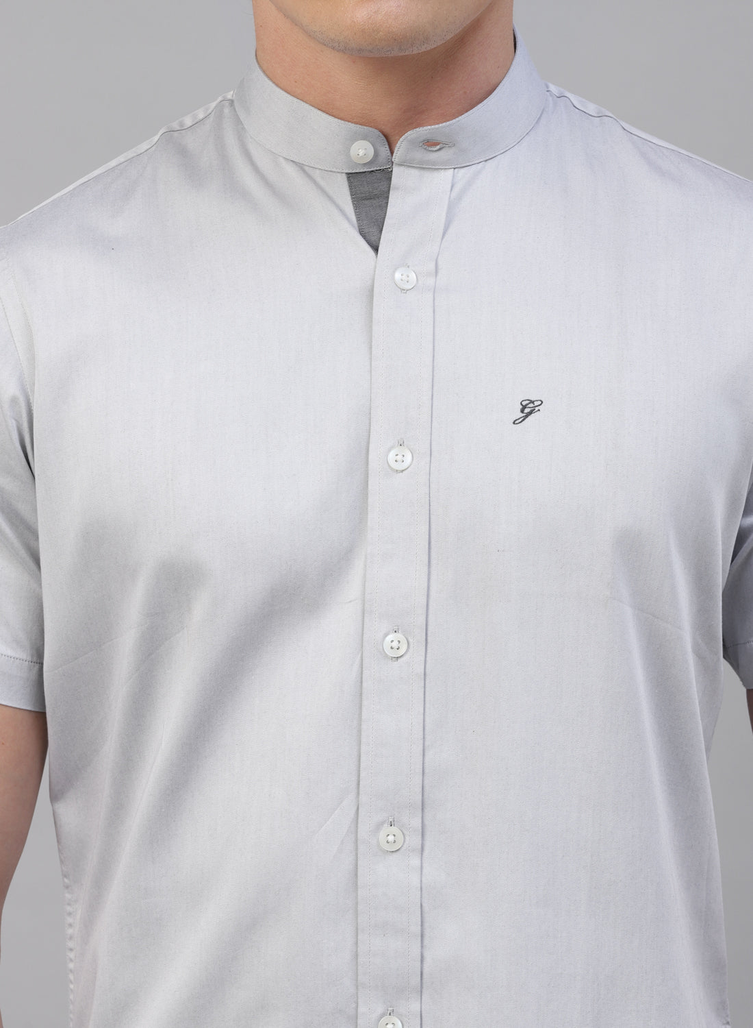 Grey Cotton Band Collar Half Sleeve Shirt