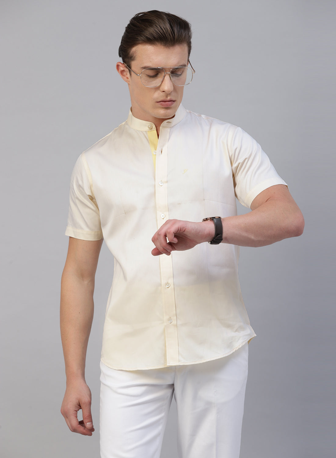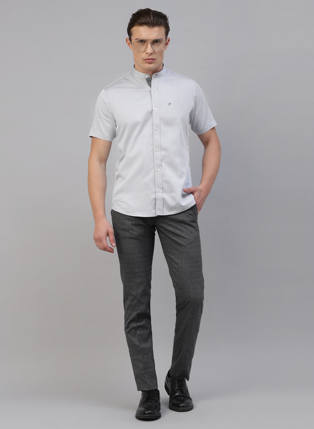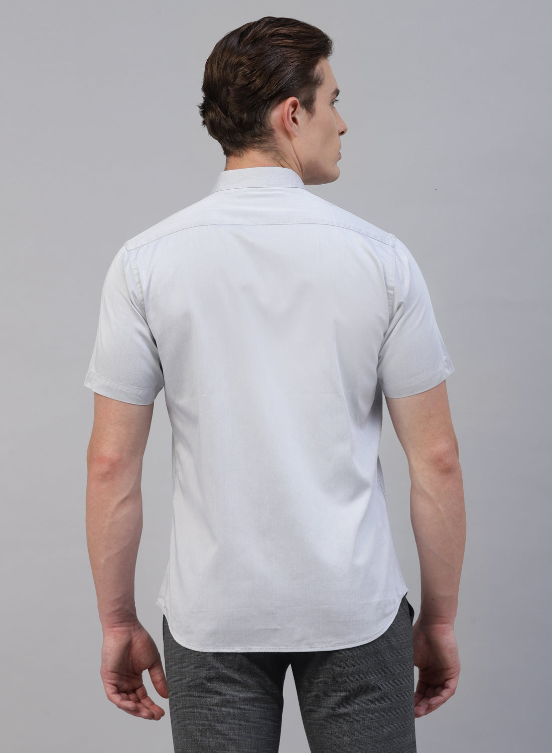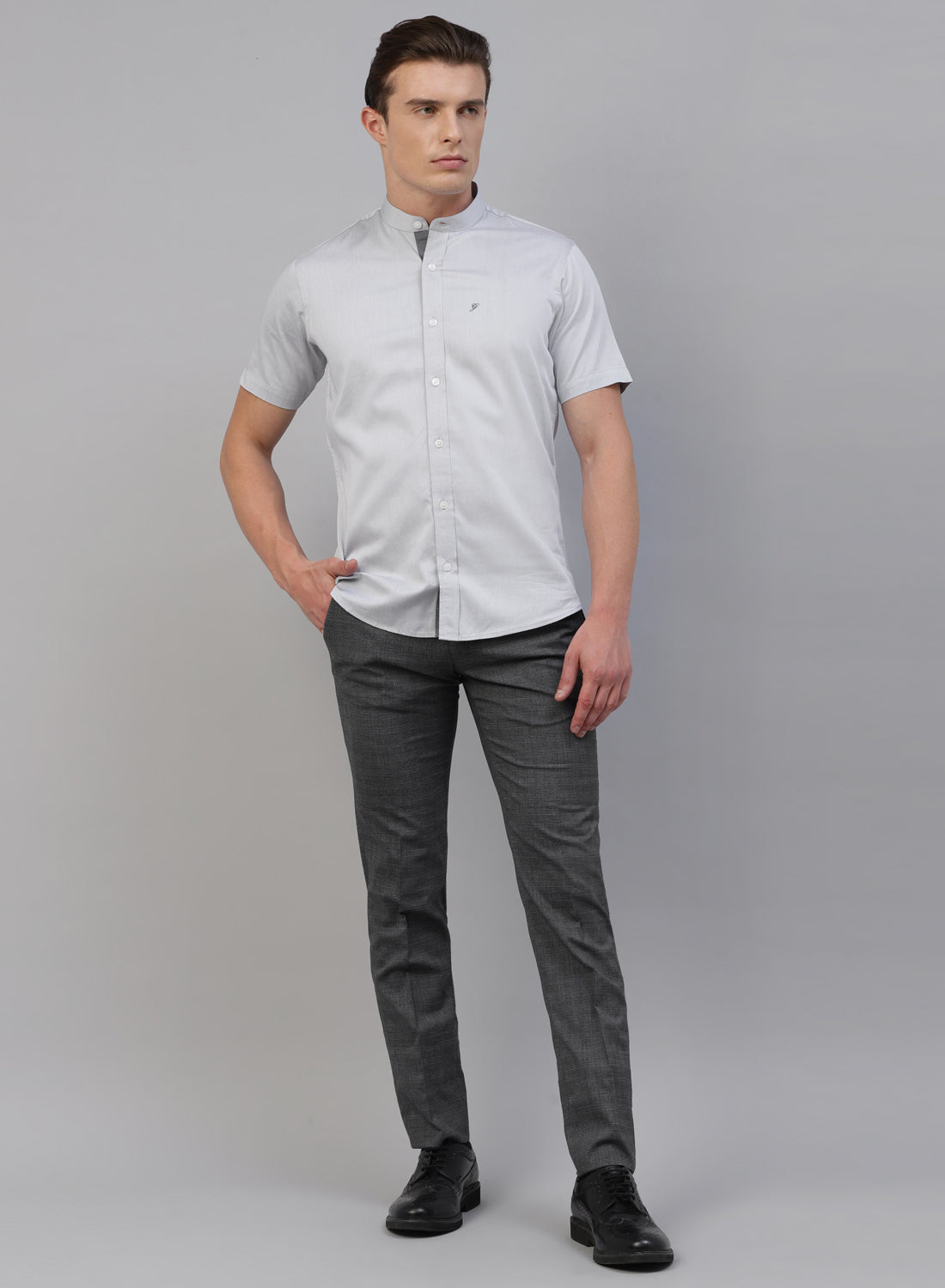 Grey Cotton Band Collar Half Sleeve Shirt